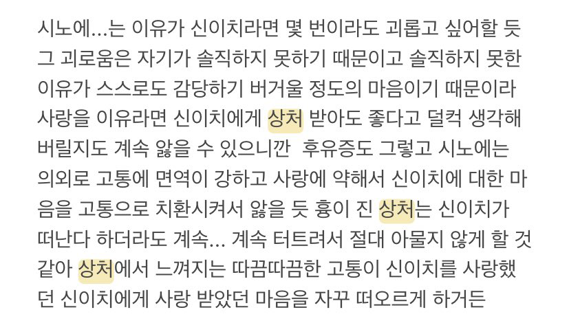 신이치는 자기가 시노에의 숨을 쥐고 있다는 사실까진 모르지 싶은데 애초에 시노에가 불안해하는 이유가 뭔지 알아도 그정도로 심각하게 불안을 겪고 있다는 건 모를 것 같음 서로 만나기 전의 모습을 모르기조 하고 알게 된다 하더라도 그 시절을 겪으면서 쌓인 내면의 상처까지는 모를 테니까...